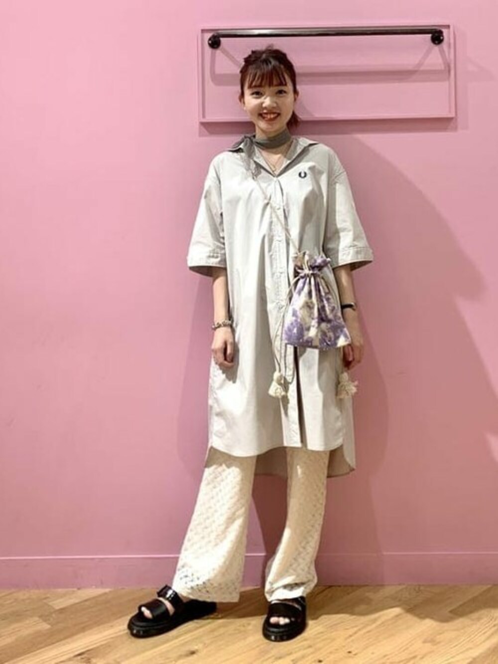 <FRED PERRY>のワンピースはチュニック丈なのでスカートやパンツで合わせるのにぴったりなアイテム♩ 足元は<Dr.Martens>の別注サンダルで夏を先取り!