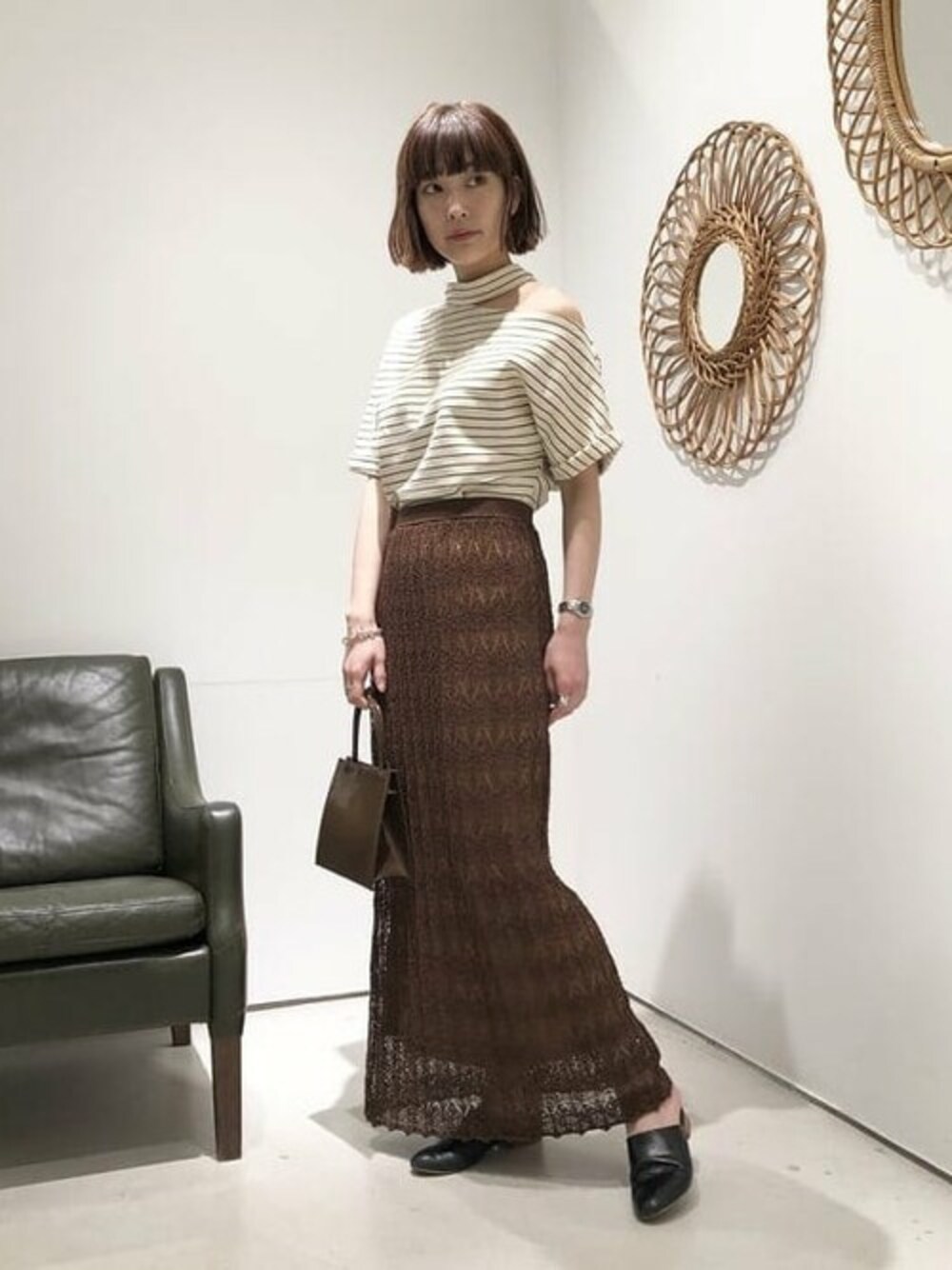 三色目のブラウンのご紹介! こちらもカラーを合わせて、ミニバッグとスリットTシャツで大人っぽくコーディネートしました。 どの色も可愛くて迷ってしまいます、、、♡ 三色とも使いやすいカラーなので、ぜひお試しください!!