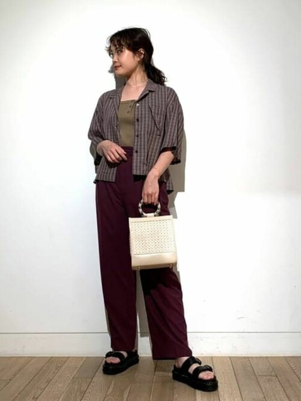 <Name. × Ray BEAMS>チェックシャツをメインにスタイリング。カジュアルになりすぎないよう、首元のスッキリしたインナーで女性らしさを意識しました。