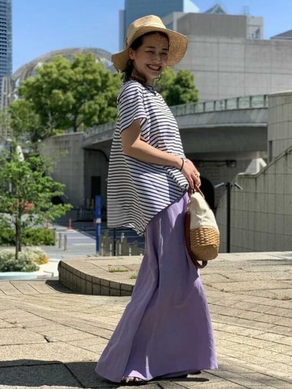 普段は避ける上下とも裾がフレアな合わせ。topsの程よいスムース感と張り感、着丈が短めのフロントがすっきりバランスをとってくれます。清涼感あるボーダーにラベンダー色で上品さプラス。