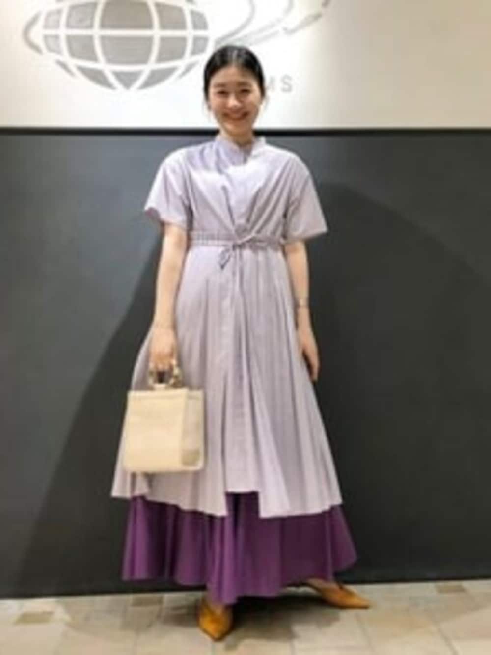パープルで合わせたレイヤードスタイル。大人気のプリーツワンピースも合わせ一つで雰囲気をガラッと変えられます。