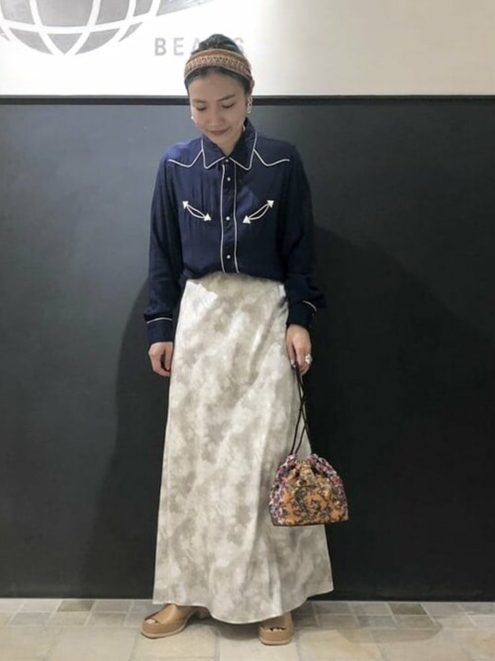 ウエスタンシャツとタイダイ柄のスカートを合わせました。