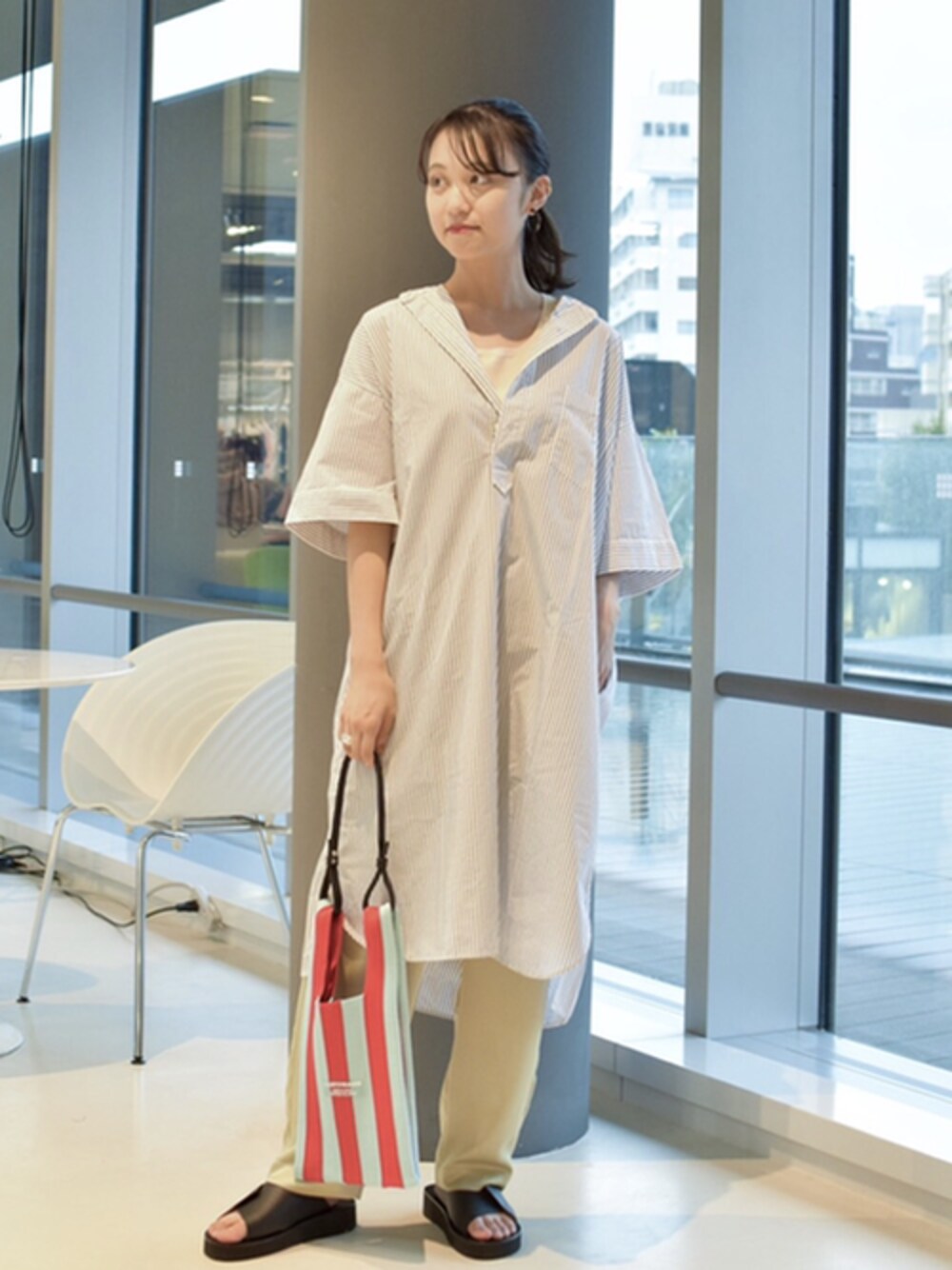 ゆったりとしたサイズ感が魅力的な、<DANTON>コットン ポプリン ストライプ ワンピース。首元を開け、涼しげなスタイリングにしました !