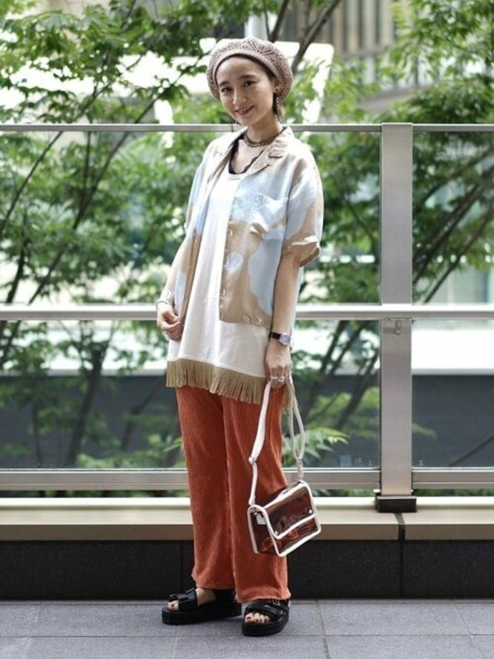 タイダイシャツとフリンジトップスでボヘミアンに。カラーパンツを合わせるのが気分です。