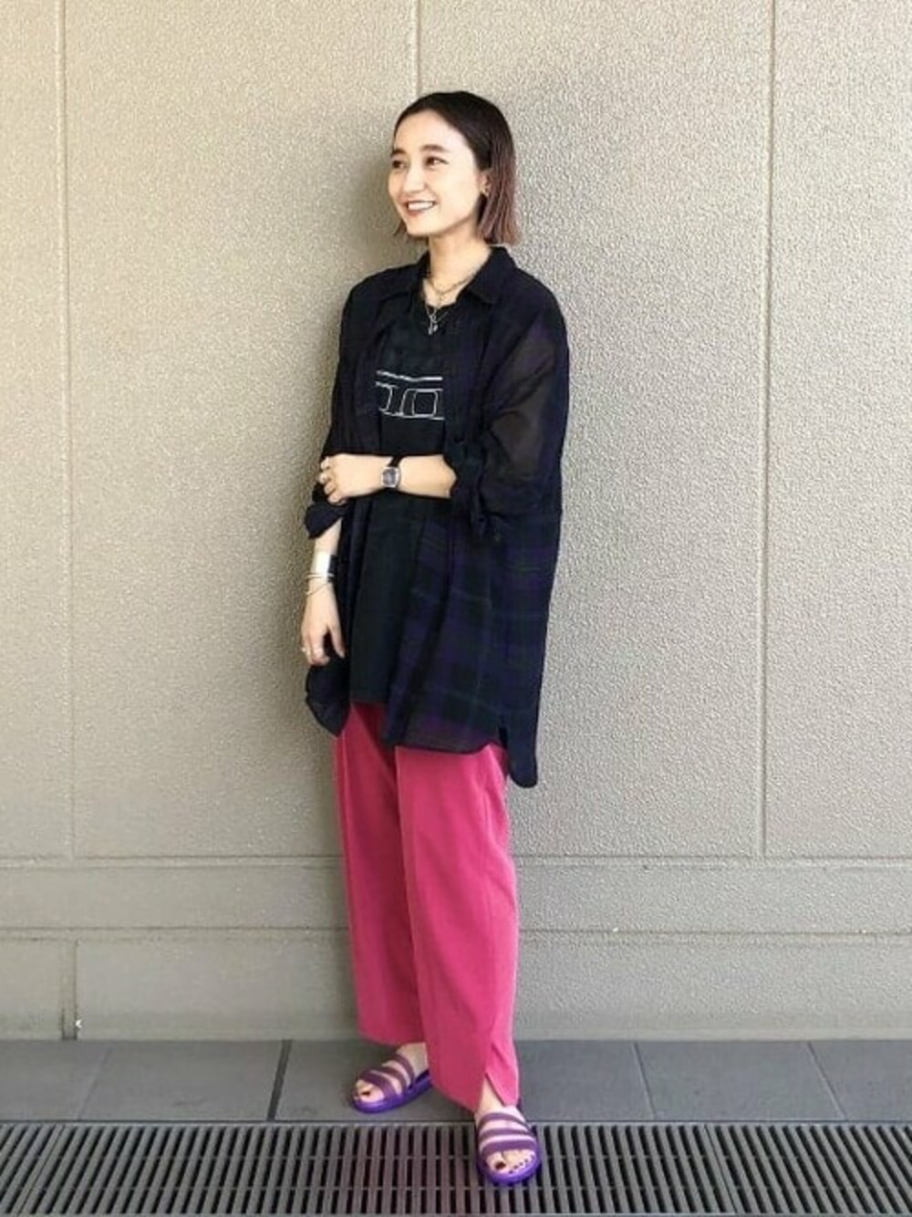 <crocs>のサンダルに合わせて他のアイテムにもピンクやパープルを使ったコーディネートで。