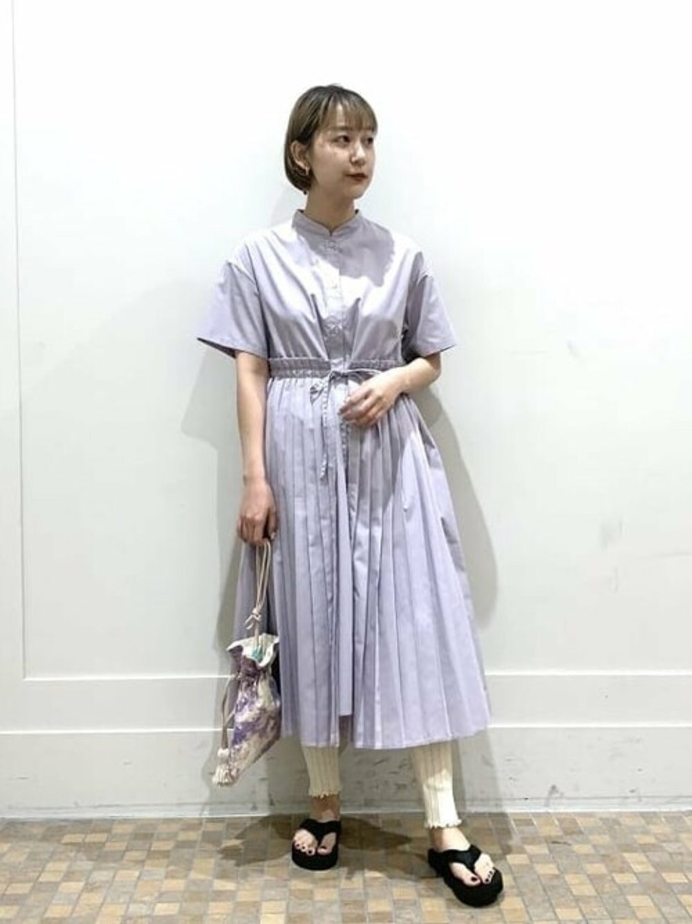 ラベンダーカラーのワンピースは ウエストの紐を自由に調節できる万能ものです!