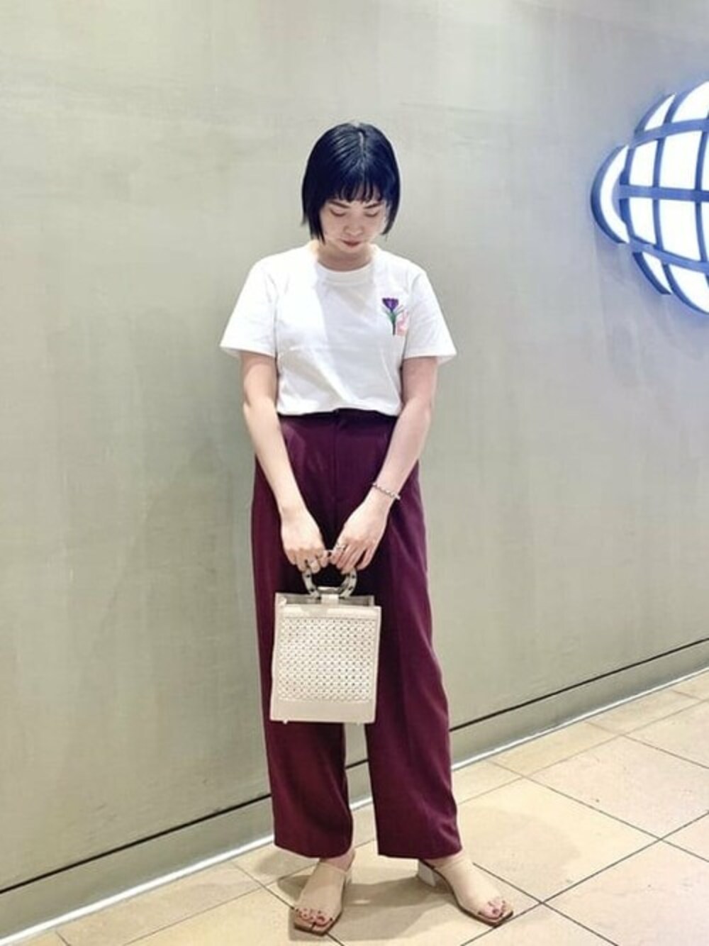 コンパクトなサイズ感のcarne BollenteのTシャツをメインにコーディネート。カジュアルすぎないように小物はベージュでまとめて女性らしさをプラス!