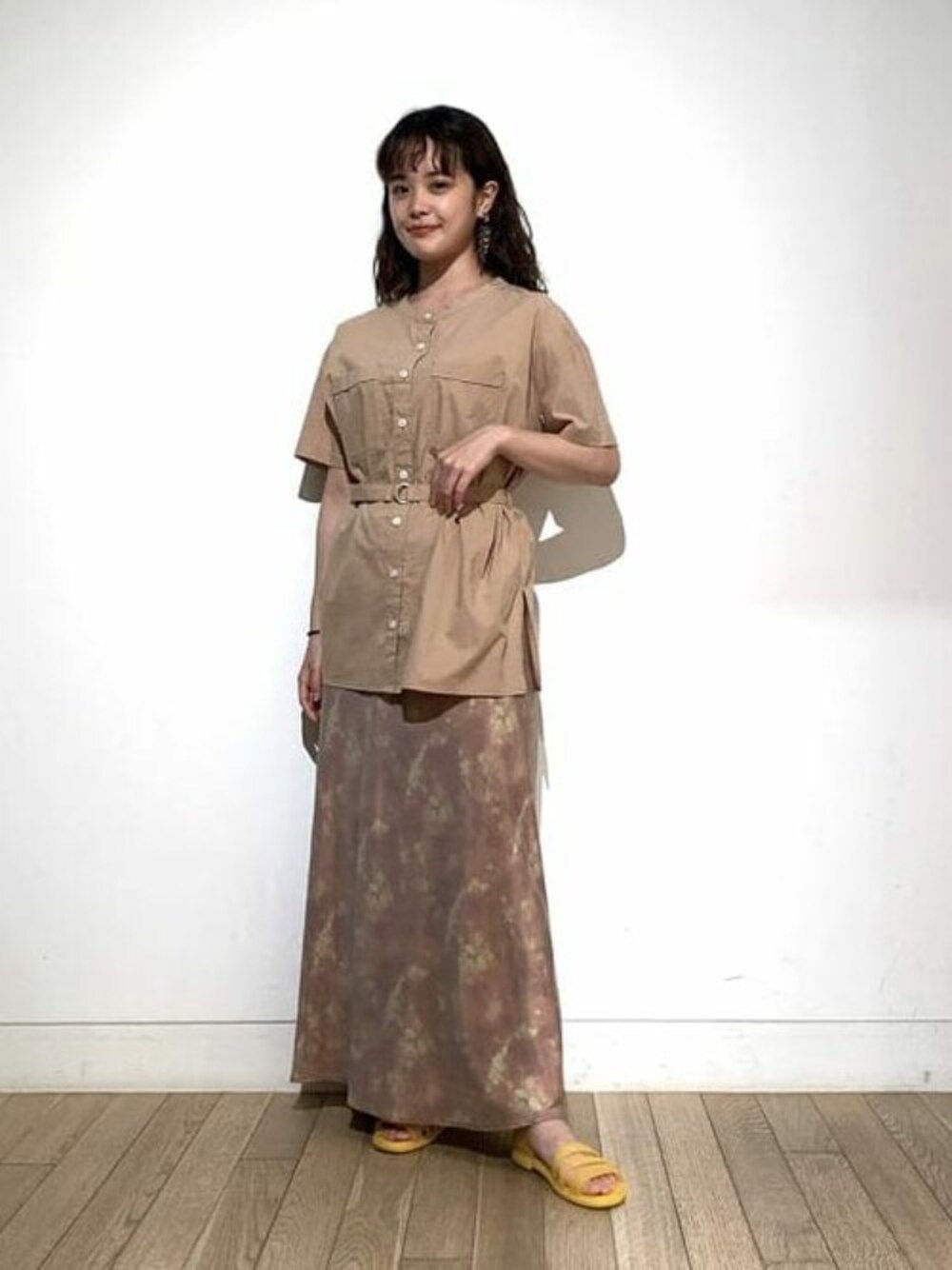 ベージュのワントーンコーデに、<crocs × Ray BEAMS>オープントゥサンダルをアクセントにしました。夏らしい色合いが可愛いです!