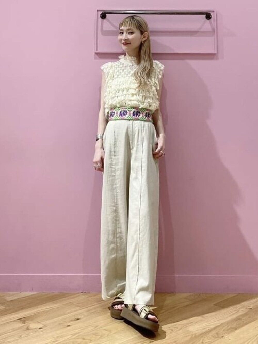 レースのトップスで甘めな印象ですが、刺繍のベルトとスポさんでギャップを演出!