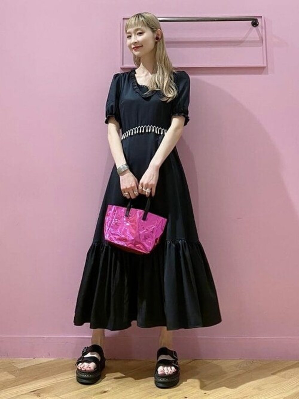 普段使いにもお呼ばれ着にもおすすめのワンピースです。メタリックカラーのバッグがポイントです。