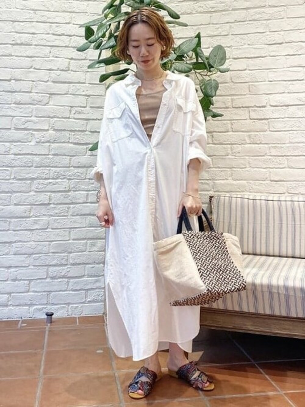 シャツワンピがシンプルなので、アフリカンな柄サンダルで色を挿しました。