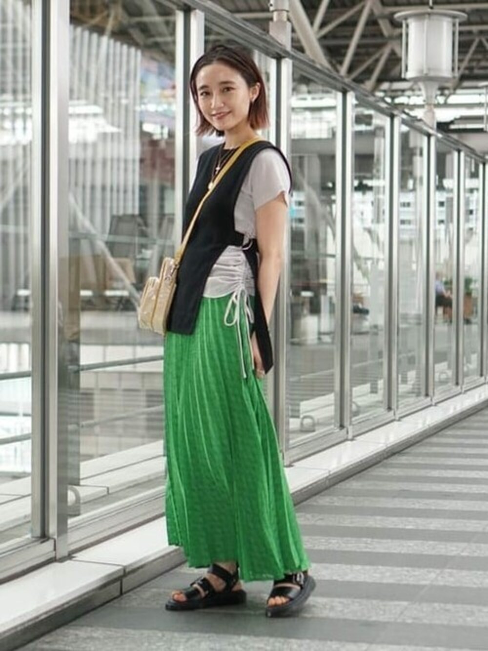 鮮やかなグリーンのプリーツスカートは千鳥柄がポイントです。サイドが可愛いTシャツとベストをレイヤードしました。