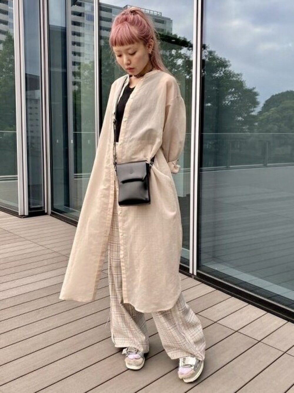 透け感が夏らしいオーガンジーシャツワンピースをメインにスタイリング!淡い色でコーディネートしながらも、ブラックの小物でメリハリをつけました。パンツは、8月下旬入荷予定です。