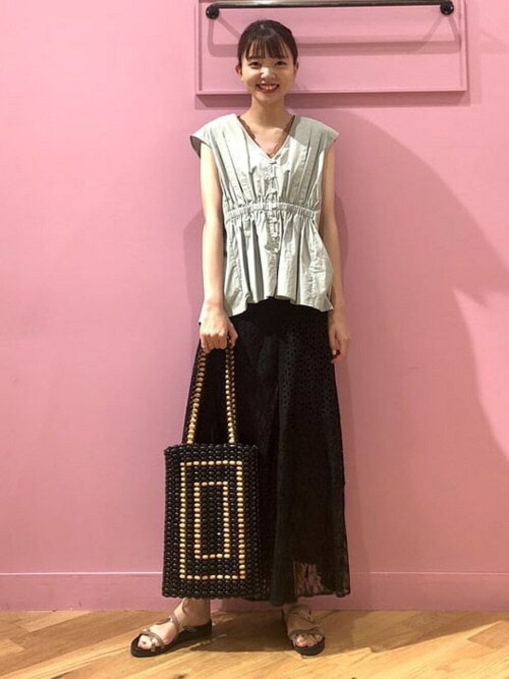😃7月のセールおすすめ商品② 🎉 ウエストギャザー Vネック ノースリーブ 爽やかなブラウスにレースのスカートを合わせました♩ ブラウスは、どんなボトムスを合わせてもすっきりとした印象に仕上げてくれます。今なら40%OFF★甘くなりすぎないように足元にパイソン柄をプラスしたのがポイントです。