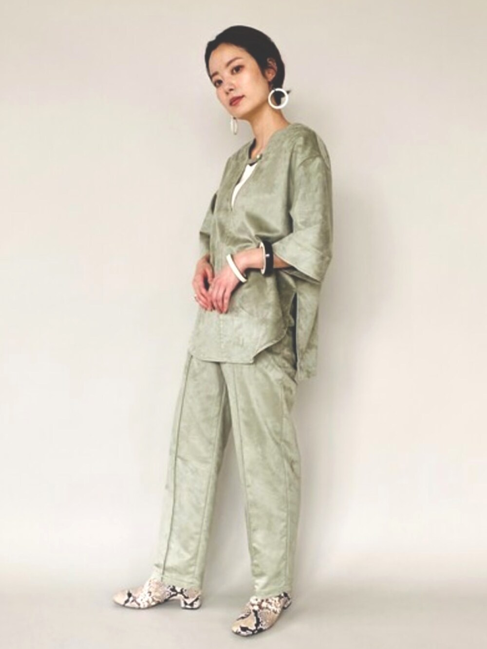 先取のおすすめコーデをご紹介! フェイクスエードのセットアップでシックな大人スタイル! ミントグリーンのセットアップは素材が色味を柔らかくしているので、肌馴染みが良く大人っぽい印象になります。 ほどよくゆとりのあるシルエットでおしゃれ感を演出しこなれた印象になります。 フェイクなので軽く柔らかいので早い時期から取り入れていただけるおすすめのトレンドアイテムです。