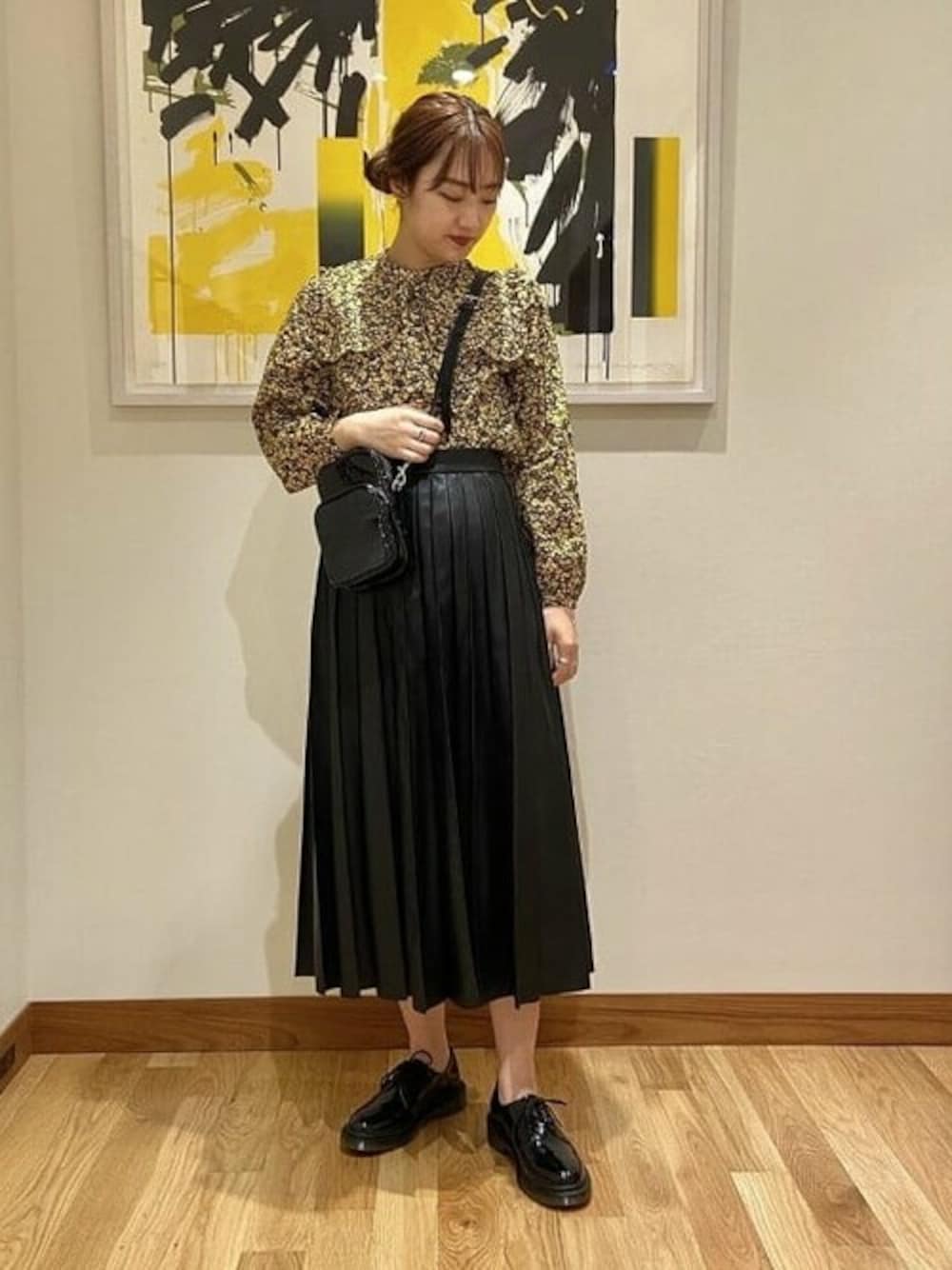 花柄×ブラック。落ち着いたお出かけコーデです。こちらのレザープリーツスカートはこの秋冬オチオシです!晩夏の時期はTシャツやブラウスで合わせ、冬になったらモコモコのニットを合わせたいです。足元はやっぱりDr.Martensがまとまります。