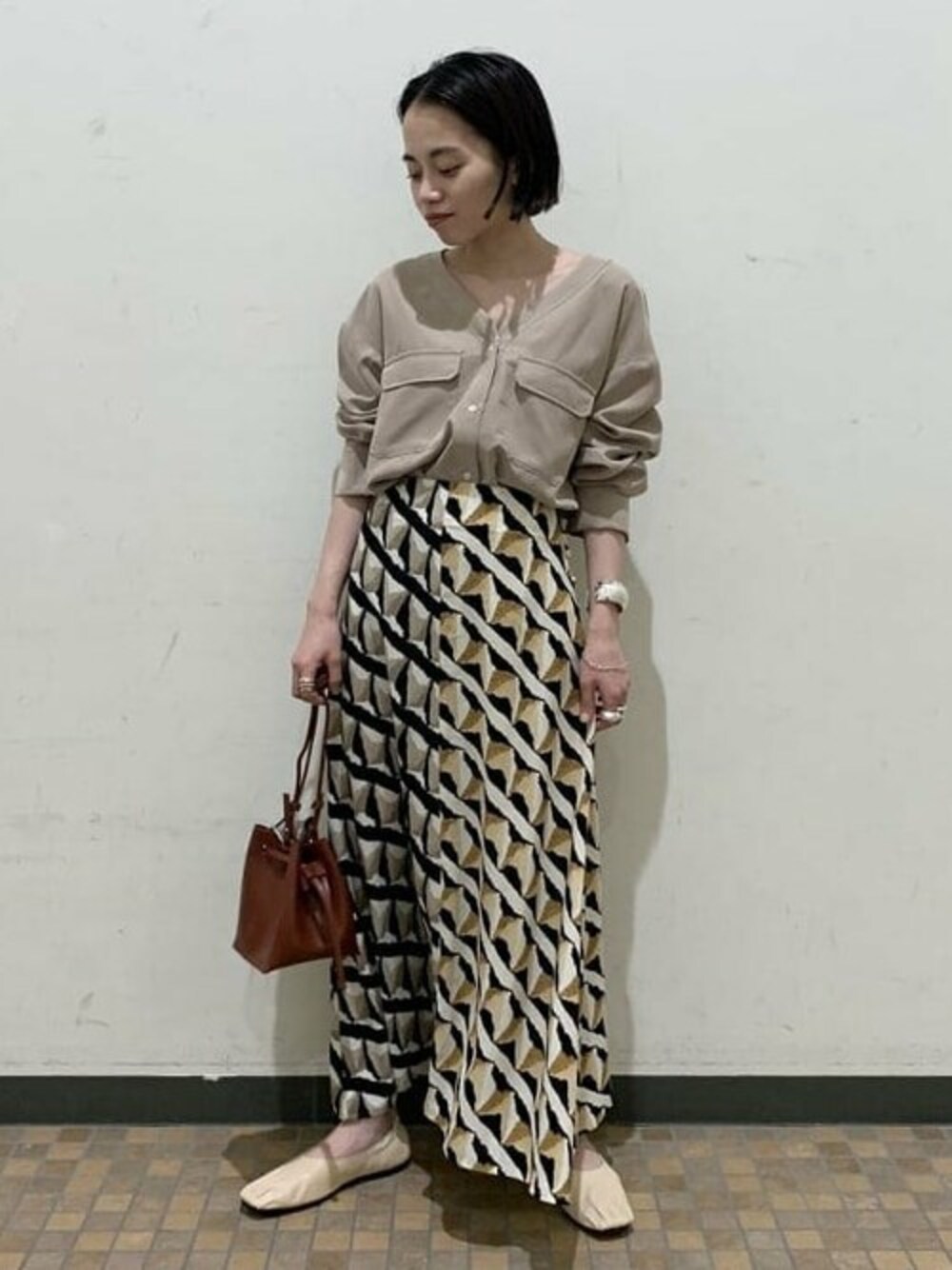 普段ならパンツ合わせですが今日はスカートで女性らしくしました。ゆったり目のサイズ感なので、合わせるボトムスによって印象が変わります。