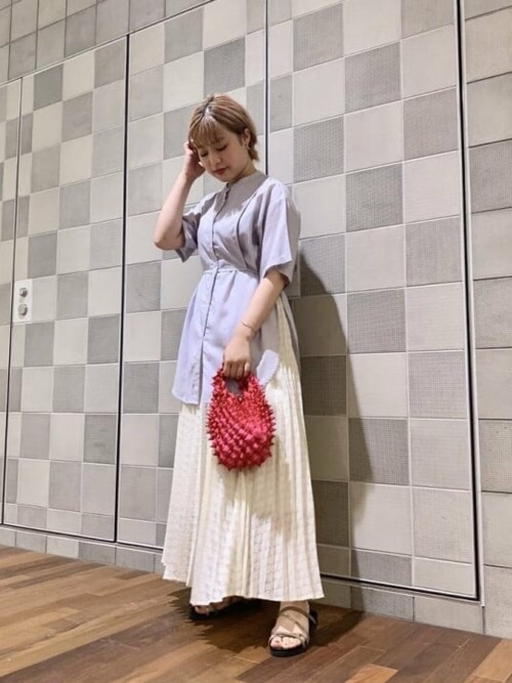 ロングシャツは、お尻が隠れる丈感になっていて、フェミニンなロングスカートと合わせていただくのがおすすめです♩ ノーカラーなので、カジュアルスタイルながらもきちんと感が出るアイテムです。