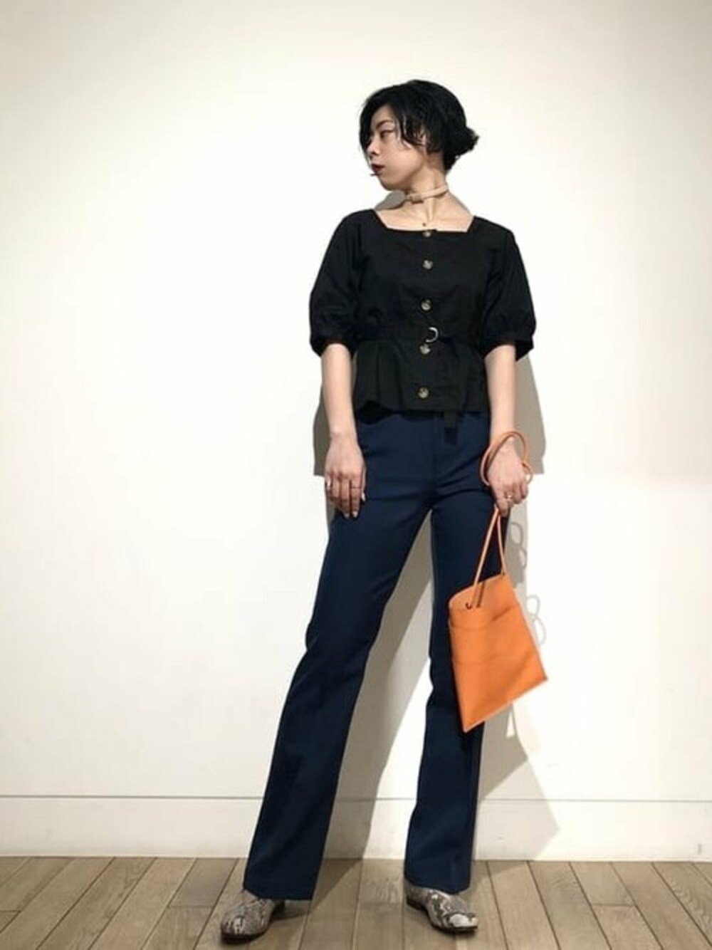 シンプルなスタイルは小物であくせんとをつけて! ブラウスのシルエットとフレアパンツの相性が抜群です。スタイルアップ効果間違いなしです!