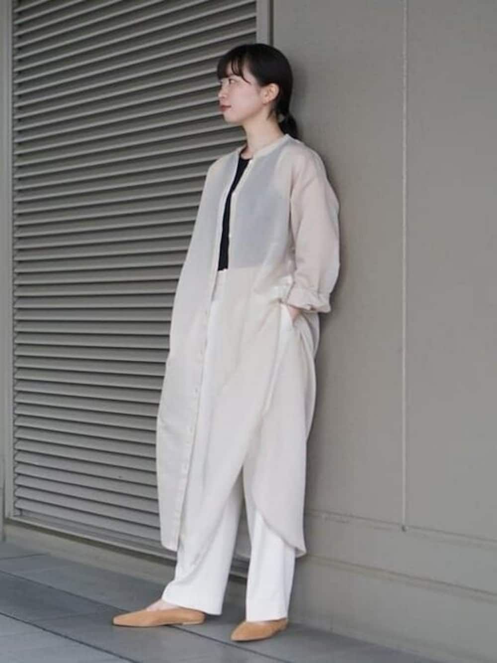 透け感のあるシャツワンピースの中に1枚できても形が可愛いタンクトップをレイヤードしホワイトパンツで爽やかにまとめました!