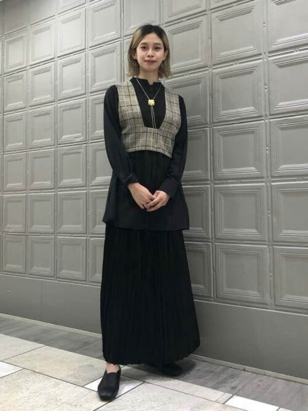 <RBS>1st delivery入荷しました! アクセサリーやシューズもブラックでまとめてジレをポイントにしました☺︎ シャツとジレは別々にも着られます。 フェイクレザーのスカートは他にはないデザインでおすすめです!