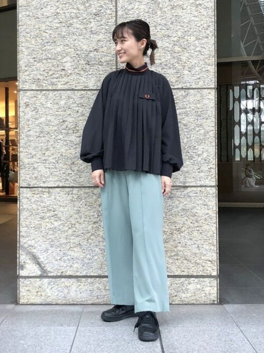 ニュアンスカラーのパンツが入荷しました☆★コンサバにならない様<FRED PERRY>のプリーツトップスでひと癖&スポーティさをプラスしました♪