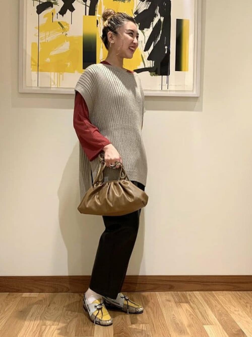 秋色でコーディネートしてみました。質感の違うニットをレイヤードし、エコレザーのパンツで締めました!