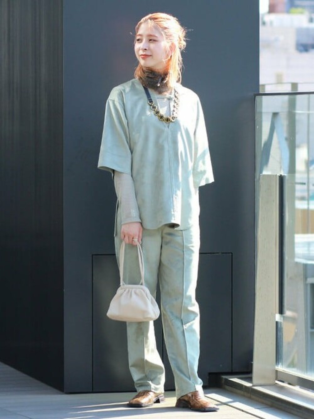 今期トレンドのスエードのセットアップでスタイリング。 首元にスカーフを巻いてボリュームを出しました。