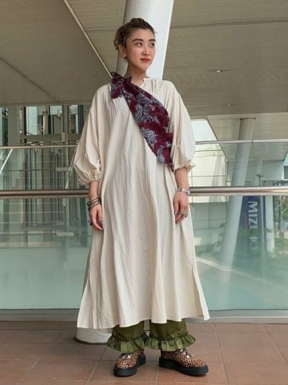 セールでとってもお得になっているこちらのワンピースをメインにスタイリングしました!<La maison de Lyllis>のカーチフや、〈BEAMS BOY〉のサテンフリルパンツで色を足しました♡シンプルなワンピースは小物使いやレイヤードもたくさん楽しめるので飽きません!!