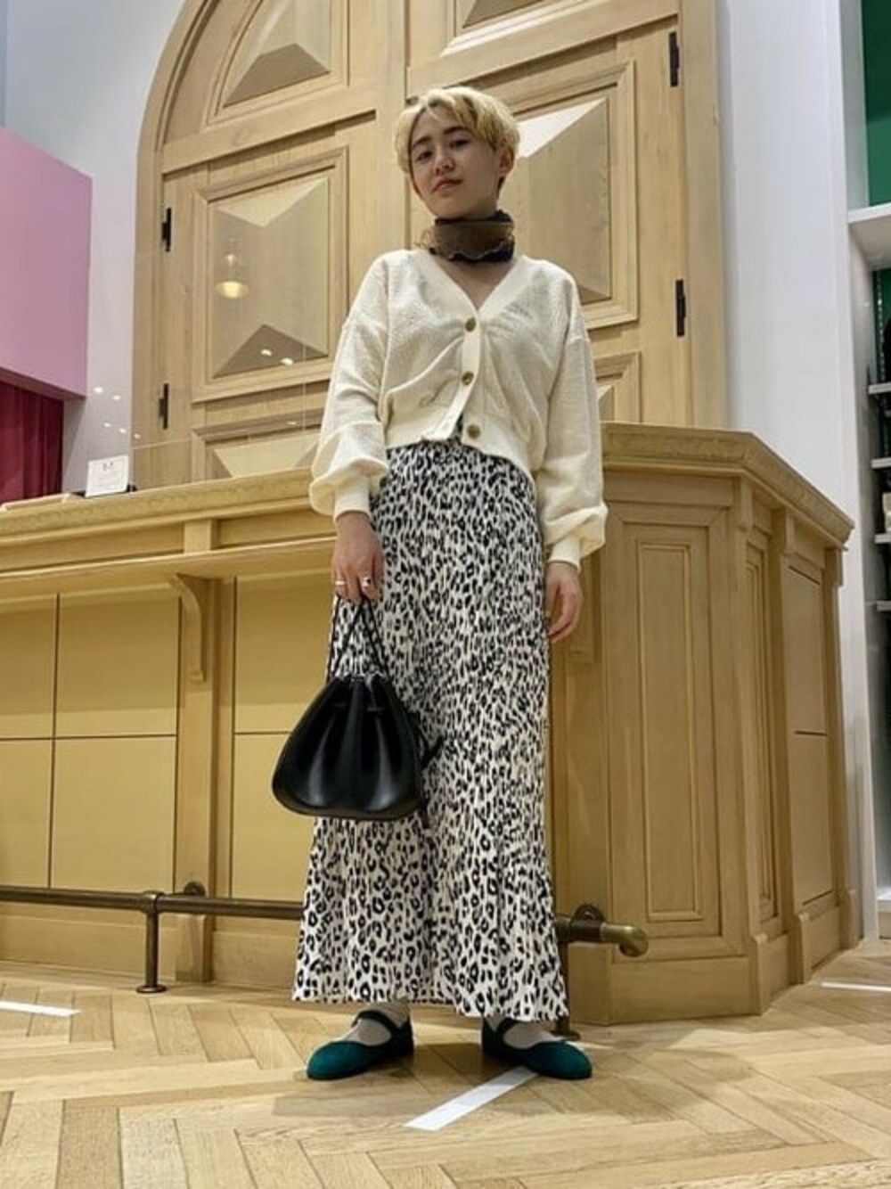可愛らしい印象のカーディガンにアニマル柄スカートとスカーフを合わせて女性らしさもある個性的な雰囲気にしました。