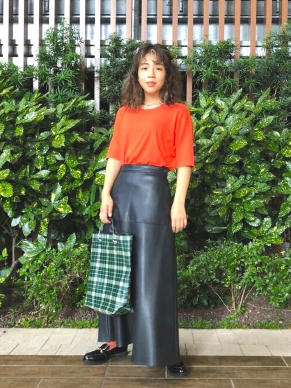エコレザーのスカートは形がとても綺麗なのでトップスはしっかりめにインしてみました。