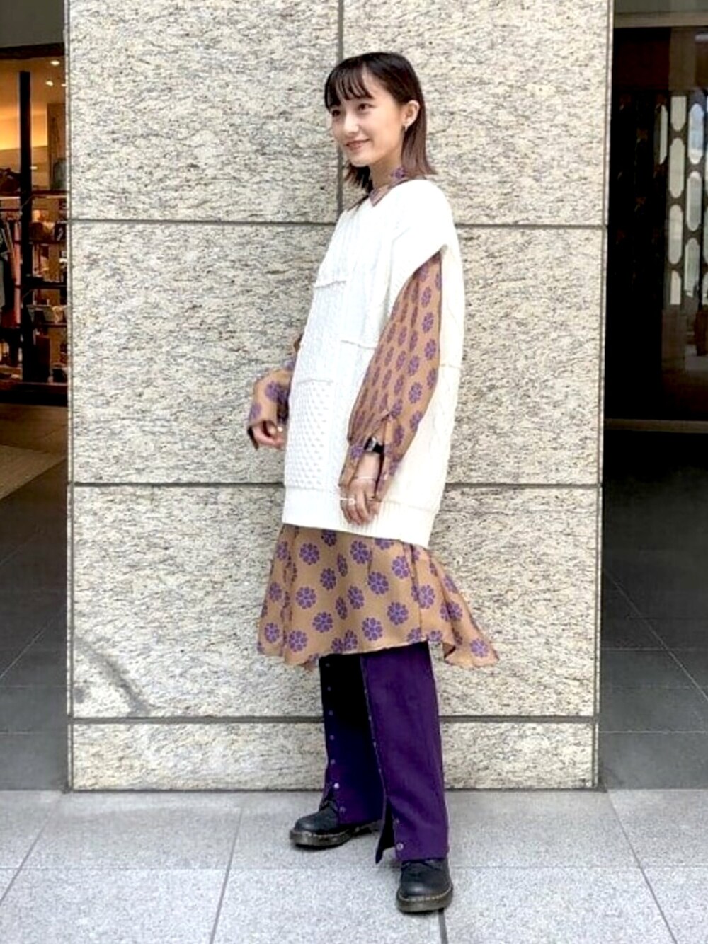 ロングワンピースにベストをレイヤードしてシルエットを変えてみました☆★ワンピースの柄とパンツのカラーを合わせたのがポイントです♪