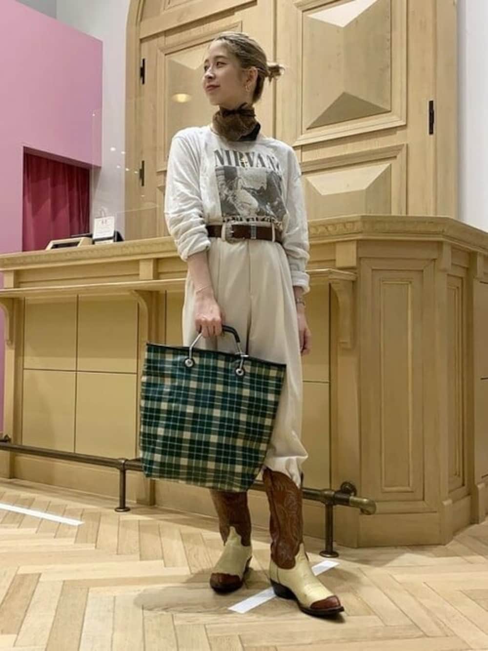 首元のスカーフがもっこり写ってますが 本当はサラッと着こなしております。 ホワイトスタイリングに小物はブラウンで統一!