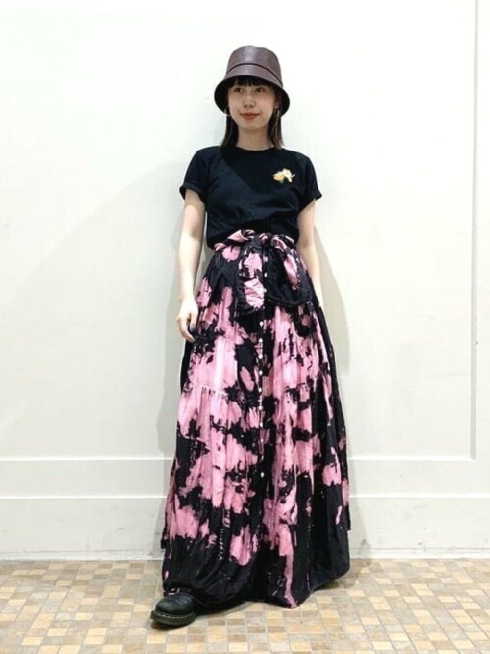 私史上初ではないでしょうか。帽子をかぶったスタイリングです。すっぽりとかぶれるので帽子に慣れていない方でも圧迫感なく使えると思います。そしてタイダイ柄のシャツワンピースを腰に巻いてスカートのように合わせました。得意な合わせです。