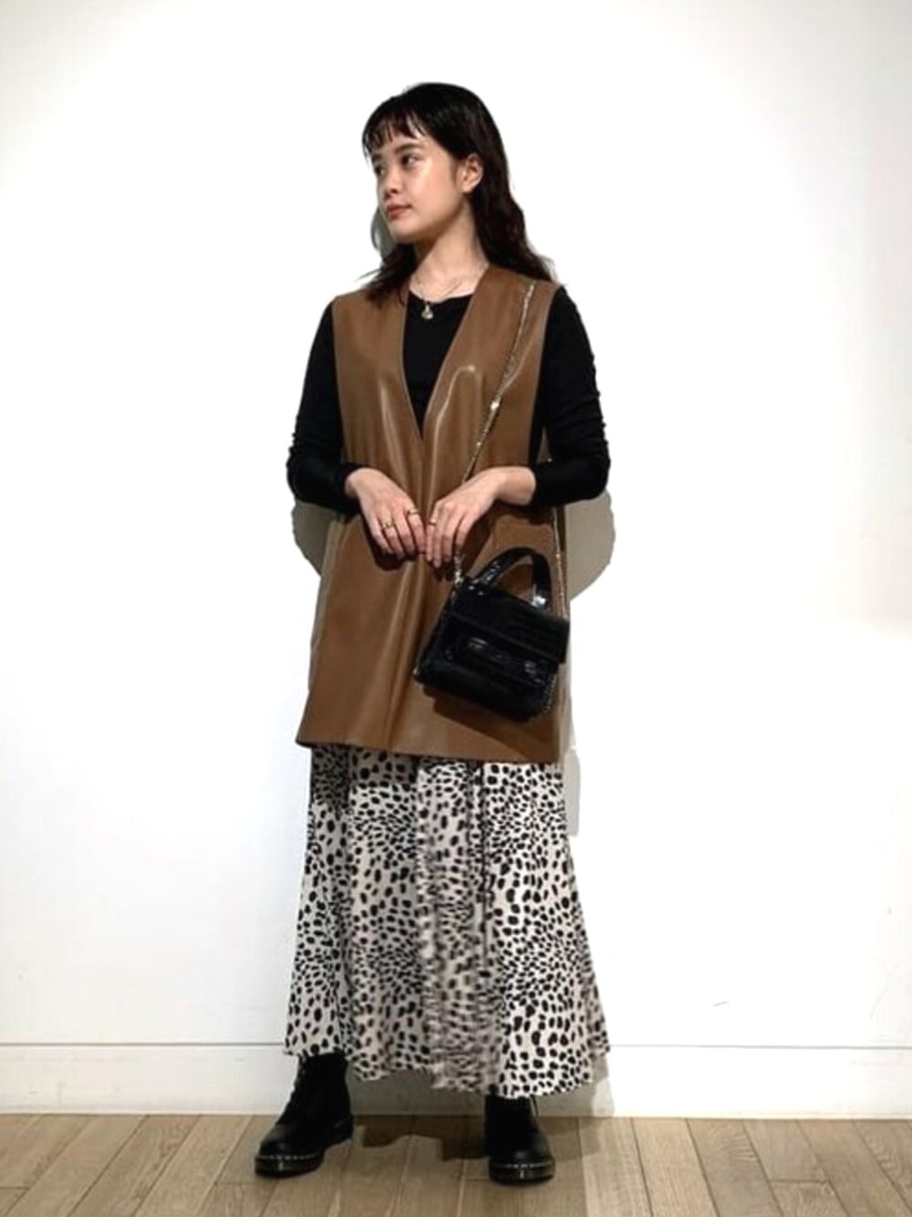 お気に入りのエコレザーロングベストは、着回ししやすくておすすめです!バッグとブーツで秋らしさをプラスしました!