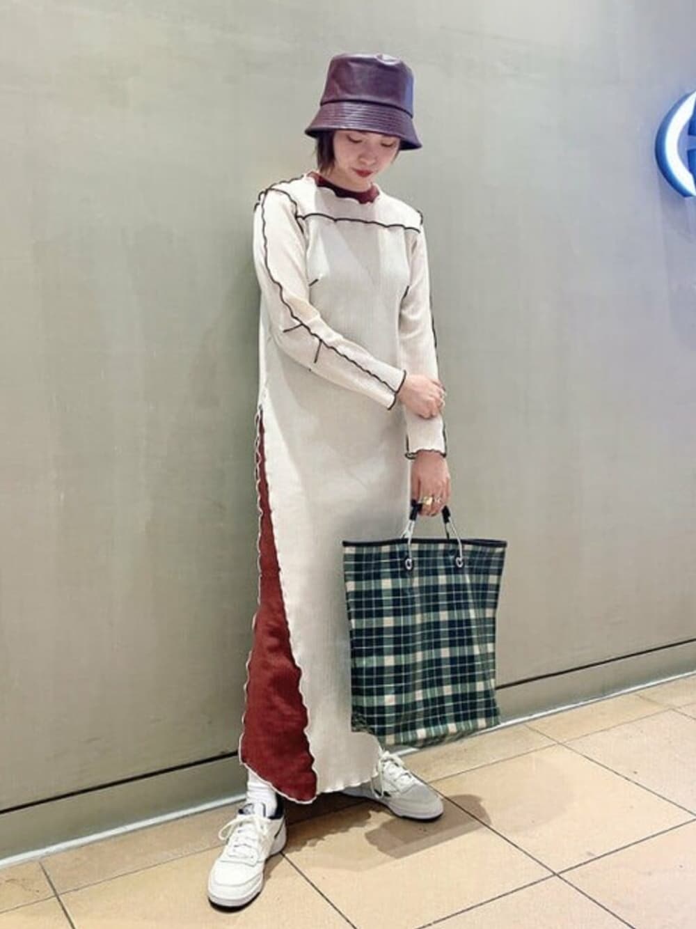 <NOMA t.d.(ノーマティーディー)>リブワンピースの色味とエコレザーハットの色をリンクさせて統一感を出しました。キャッチーなデザインのカバンは昨年も人気だったシリーズの新作です♪