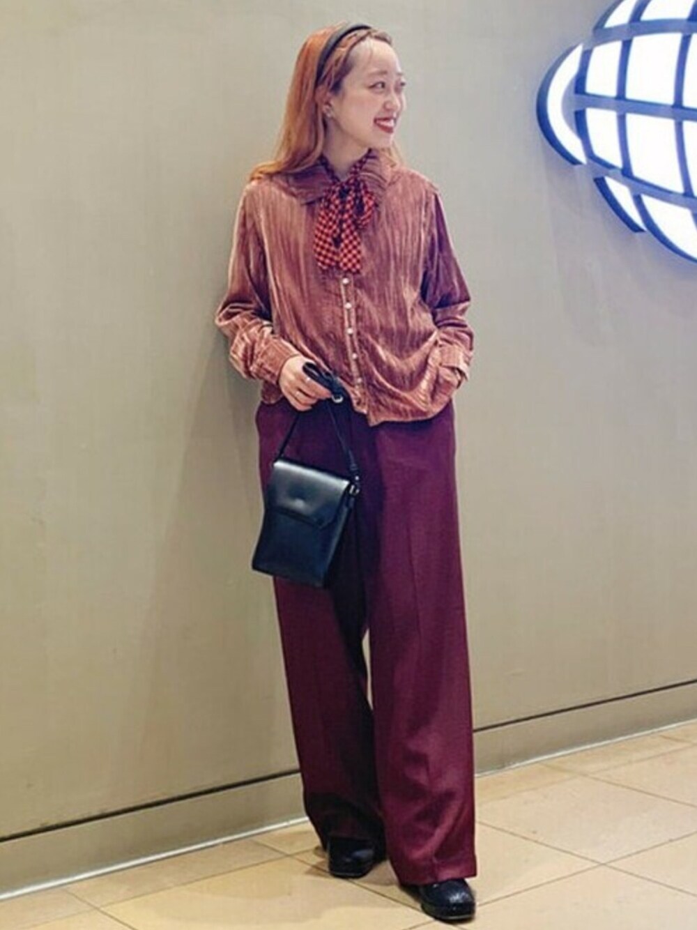 ベロアシャツは一枚で華やかですが、秋の重ね着にもオススメのアイテムです。ツイードパンツは太めのシルエットで、カッコ良くvintageな雰囲気に。全体的に同じトーンでまとめてみました♪