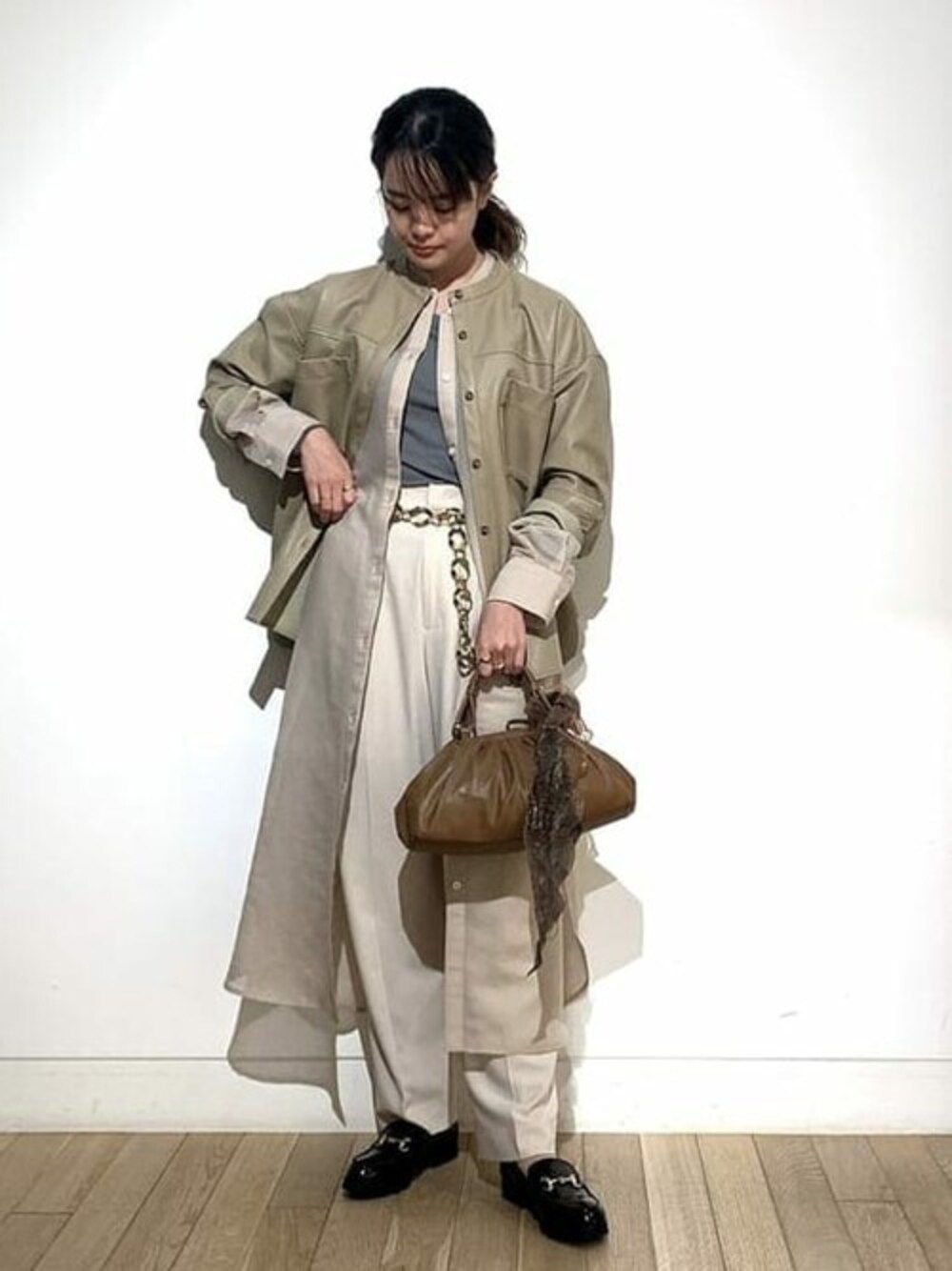シャツを重ねたレイヤードスタイルに挑戦してみました!トレンドのエコレザー素材が、シーズンムードを演出してくれます♪