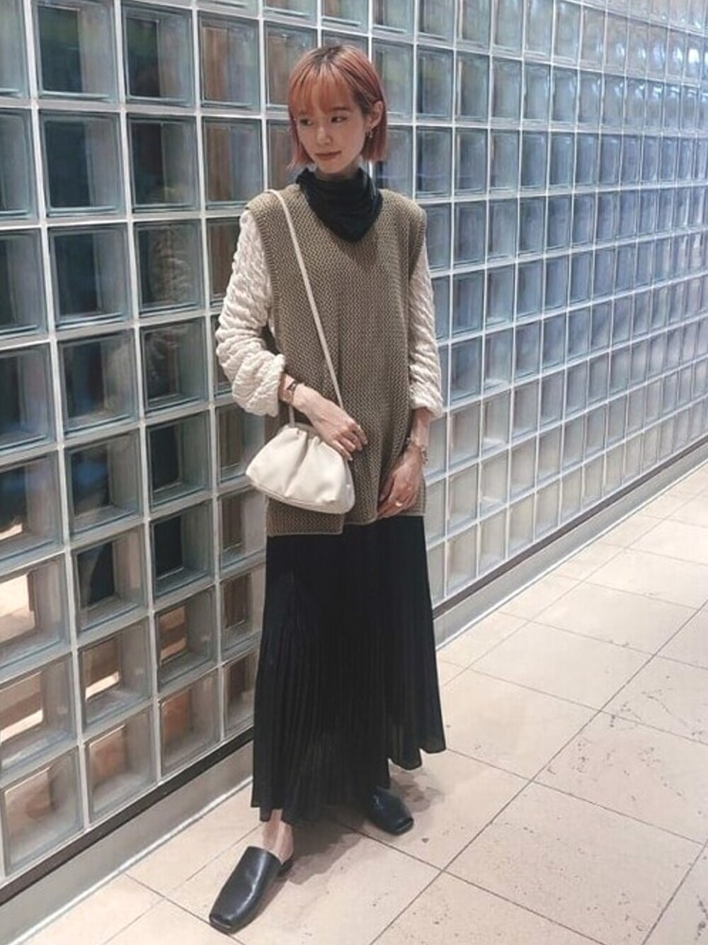 トレンドのフェイクレザーのスカーフをポイントにしたスタイリング◎メッシュ編みがかわいいニットベストはバックスタイルも抜かりなしです!