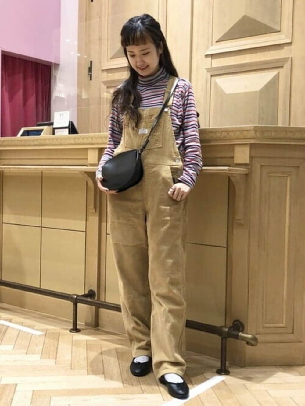 リーバイスのオーバーオールをメインにしたカジュアルなスタイリング。足元はあえてレザーのバレエシューズを合わせて引き締めました!