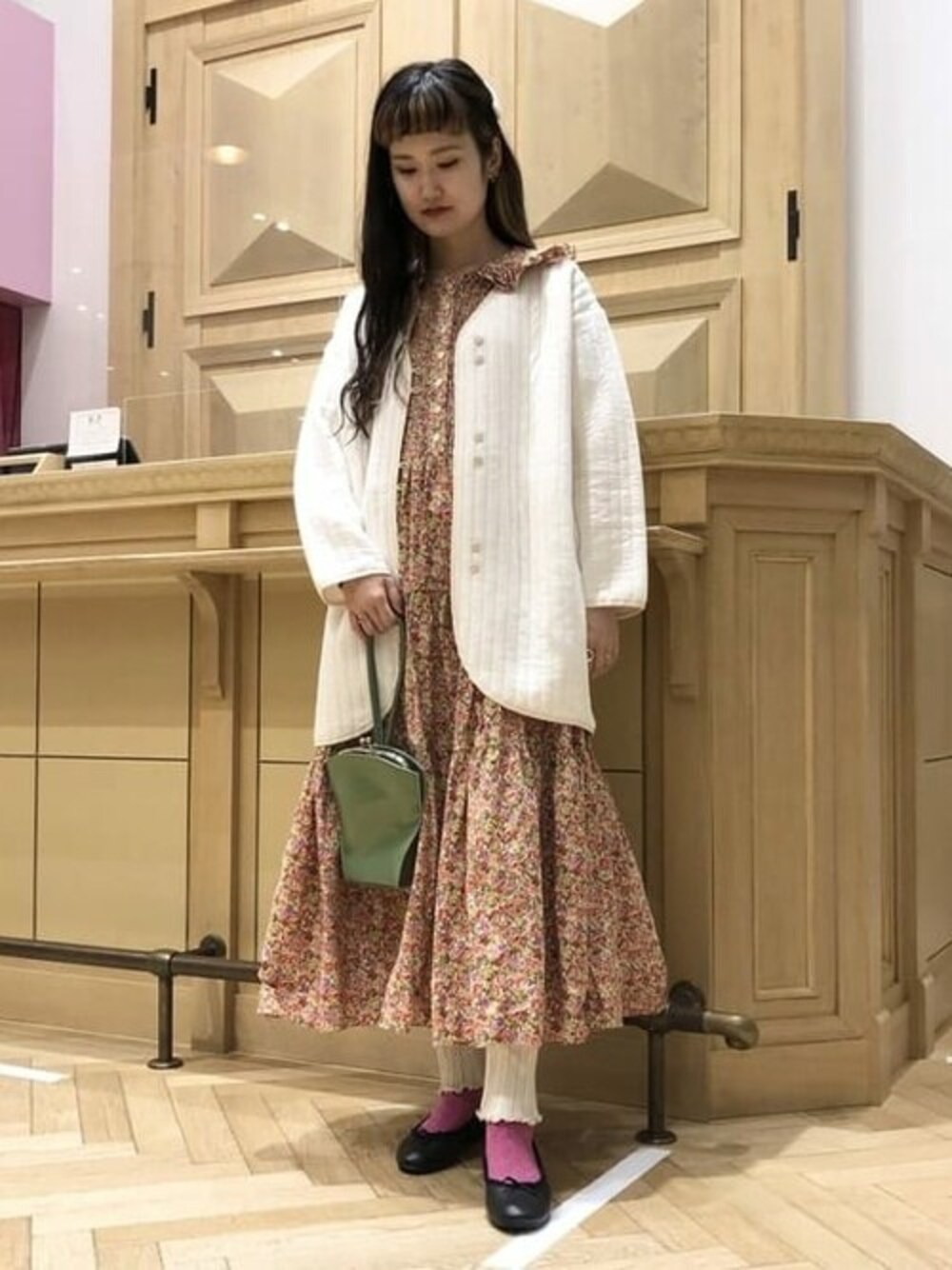ノーカラーのカーディガンに、丸襟のワンピースを合わせました。 こちらのカーディガンは少し長めの着丈なので、お尻がすっぽり隠れて暖かさも申し分無く、更に体型もカバーしてお召し頂けますよ^_^