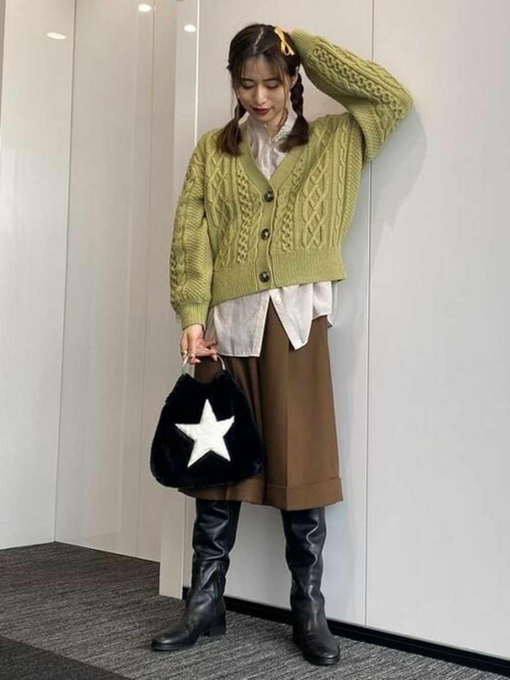 ニーハイブーツを使用したスタイリングです! シャツ、ニットカーディガン、ハーフパンツを合わせてちょっぴり英国学生気分で着てみました◎バッグのカラーはEC限定予約アイテムなのでぜひチェックしてみてください♪