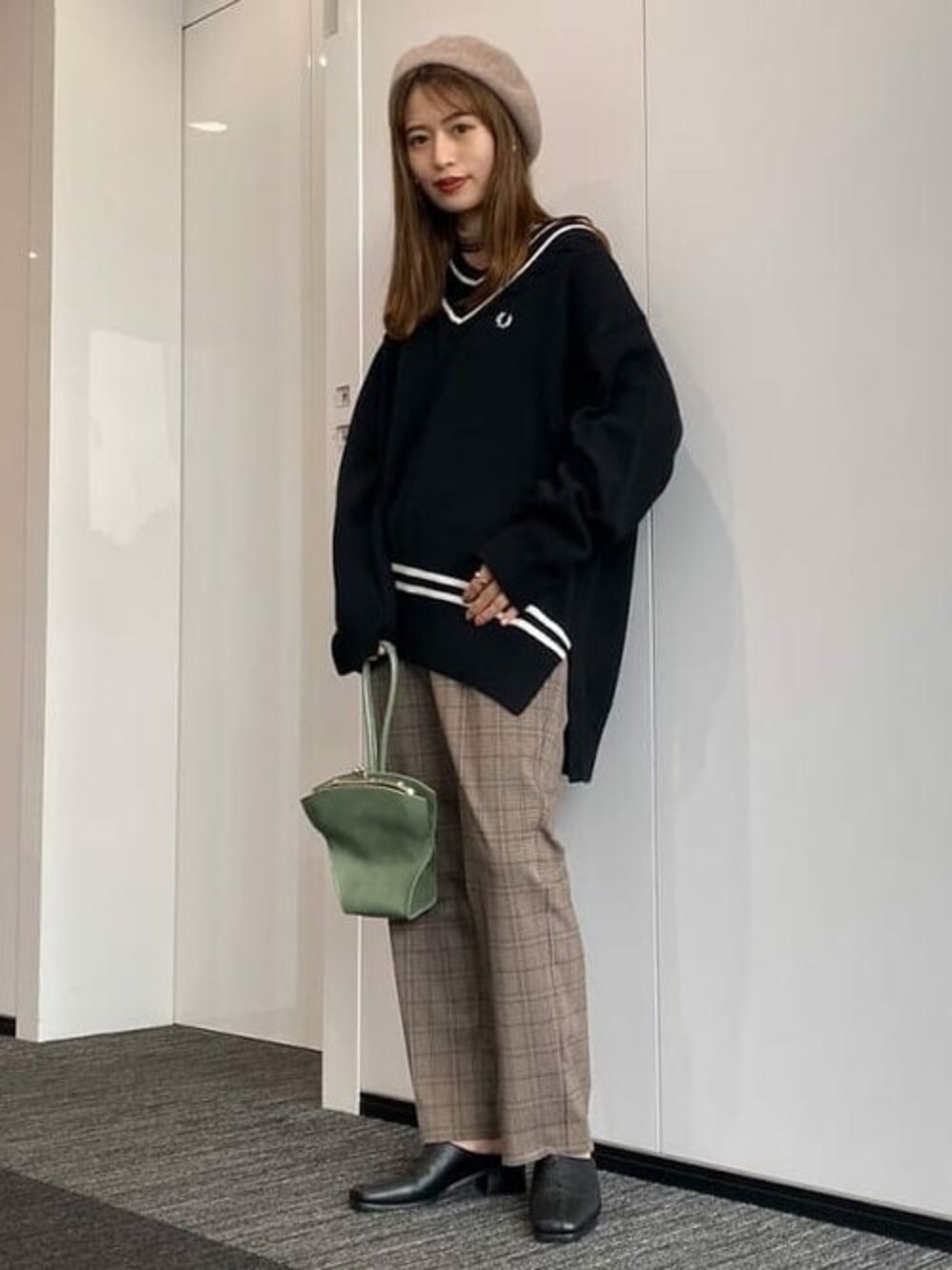 <FRED PERRY>別注のラインニット、シルエットが個人的に満点です。パンツに合わせてもスカートに合わせてもフロントとバックの長さが違うからバランスが取りやすいです◎ 今回はチェックパンツにミュールを合わせちょっぴりハンサム風です。