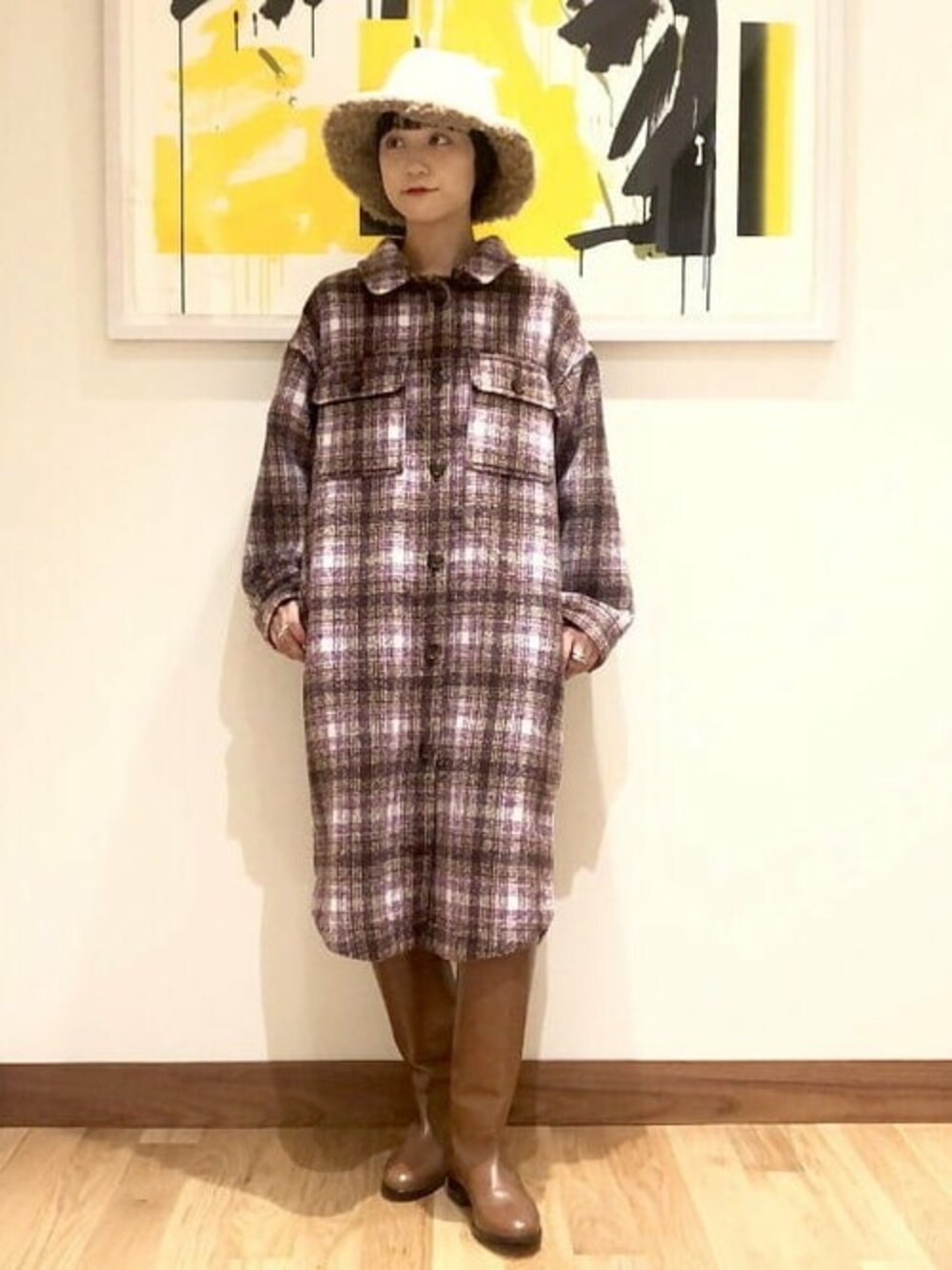 <Ray BEAMS>のコートをメインにスタイリング。紫をアクセントとした、チェック柄がとってもキュート。
