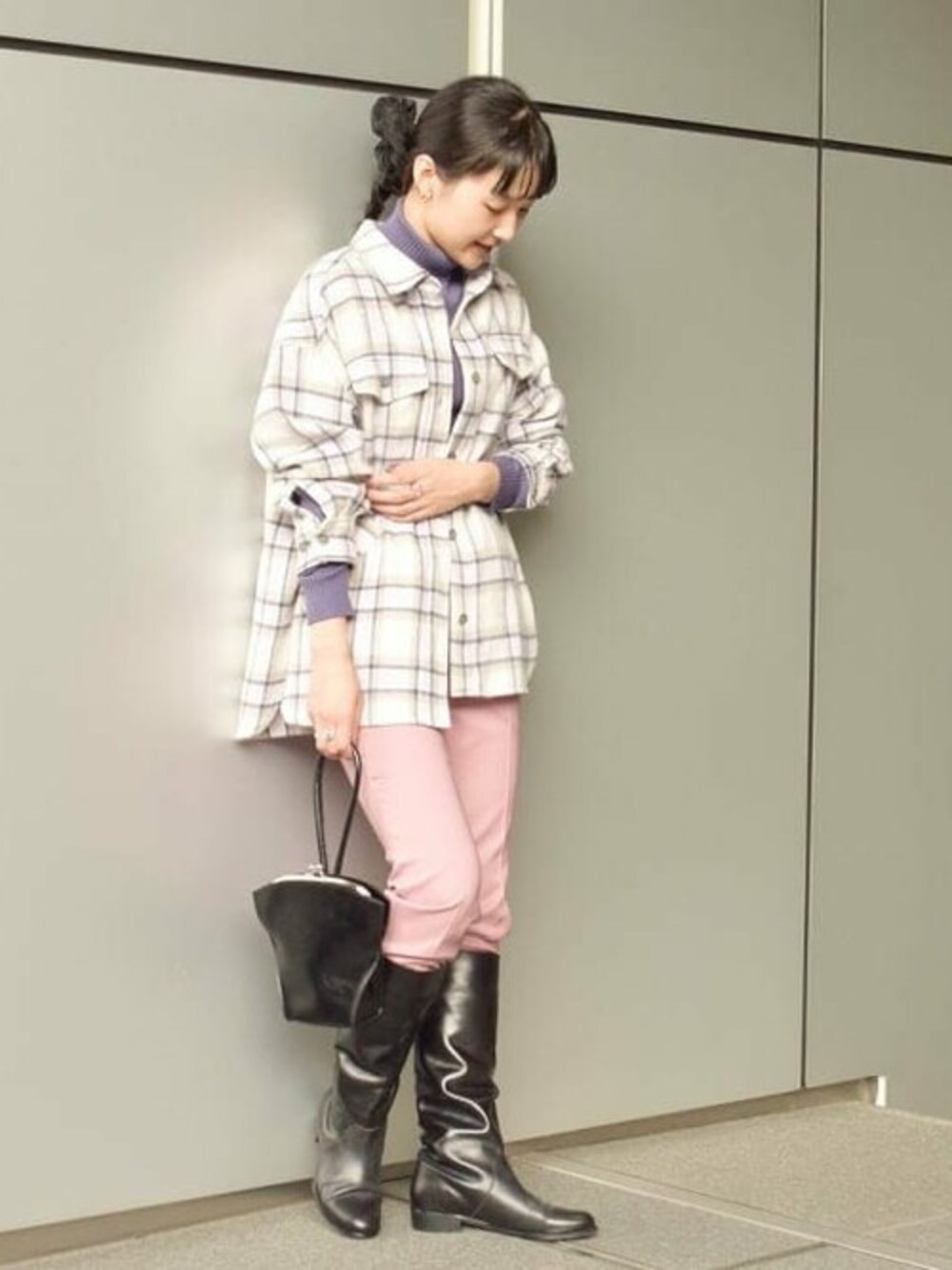 ピンク×パープルって可愛いですよね♡甘くなりそうなカラーだったのでエッジを効かせてロングブーツにボトムをインしました!ロングブーツこの冬かなり使えるなぁ〜♡