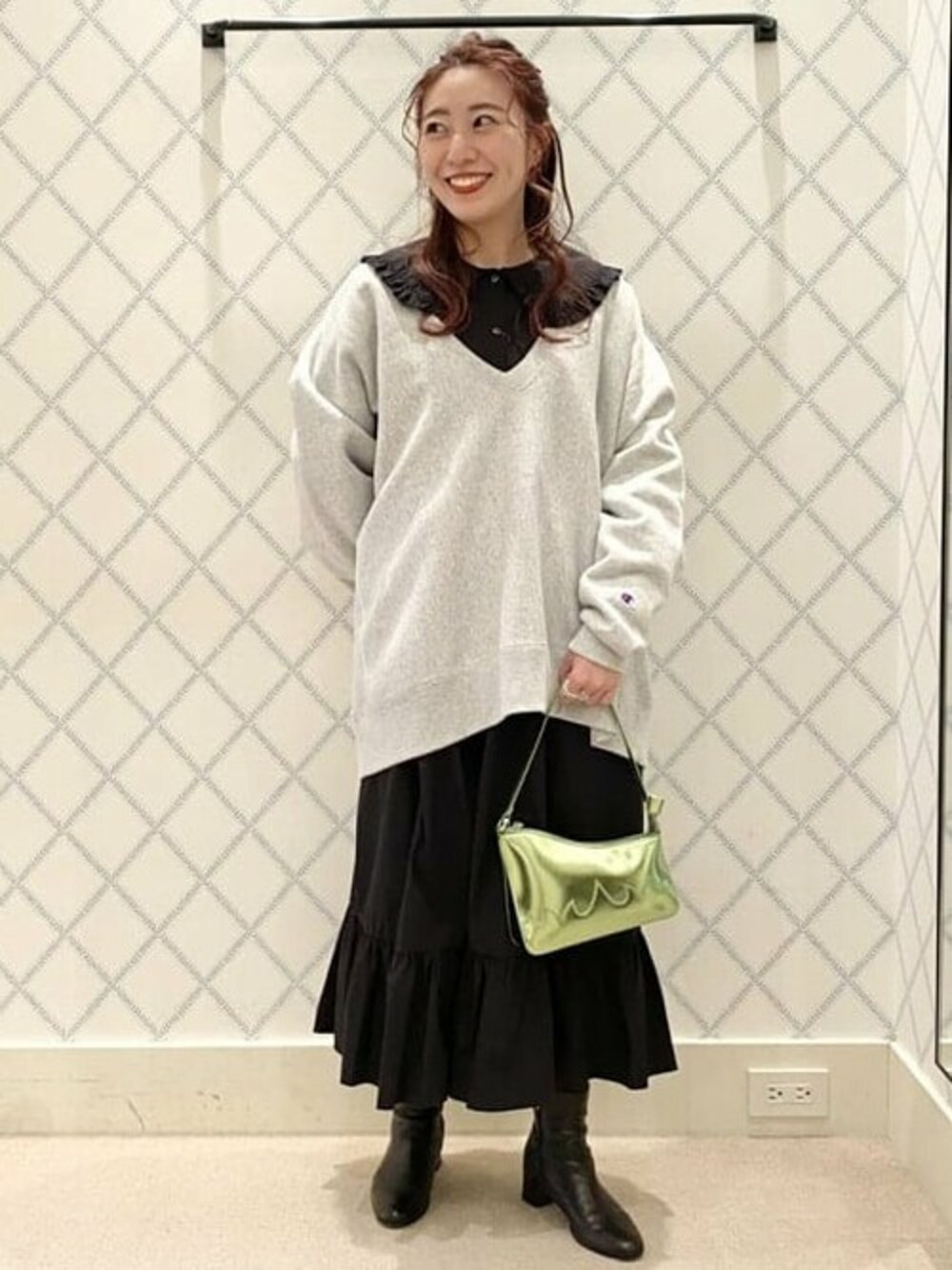 〈Champion〉×〈Ray BEAMS〉Vネックのスウェットなんて珍しい‼︎私らしくフリルがついているシャツワンピースと合わせました!
