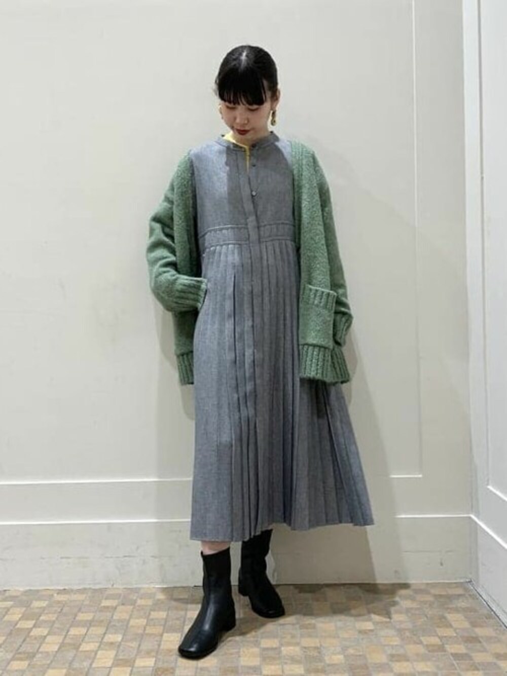 形の綺麗なプリーツのワンピースは、清楚にまとめてみたくなりました。ゆったりサイズのカーディガンを合わせて図書館にでもいきたいですね。シンプルになりすぎないようカーディガンのカラーとイエローのインナーを少し覗かせて一癖加えました。