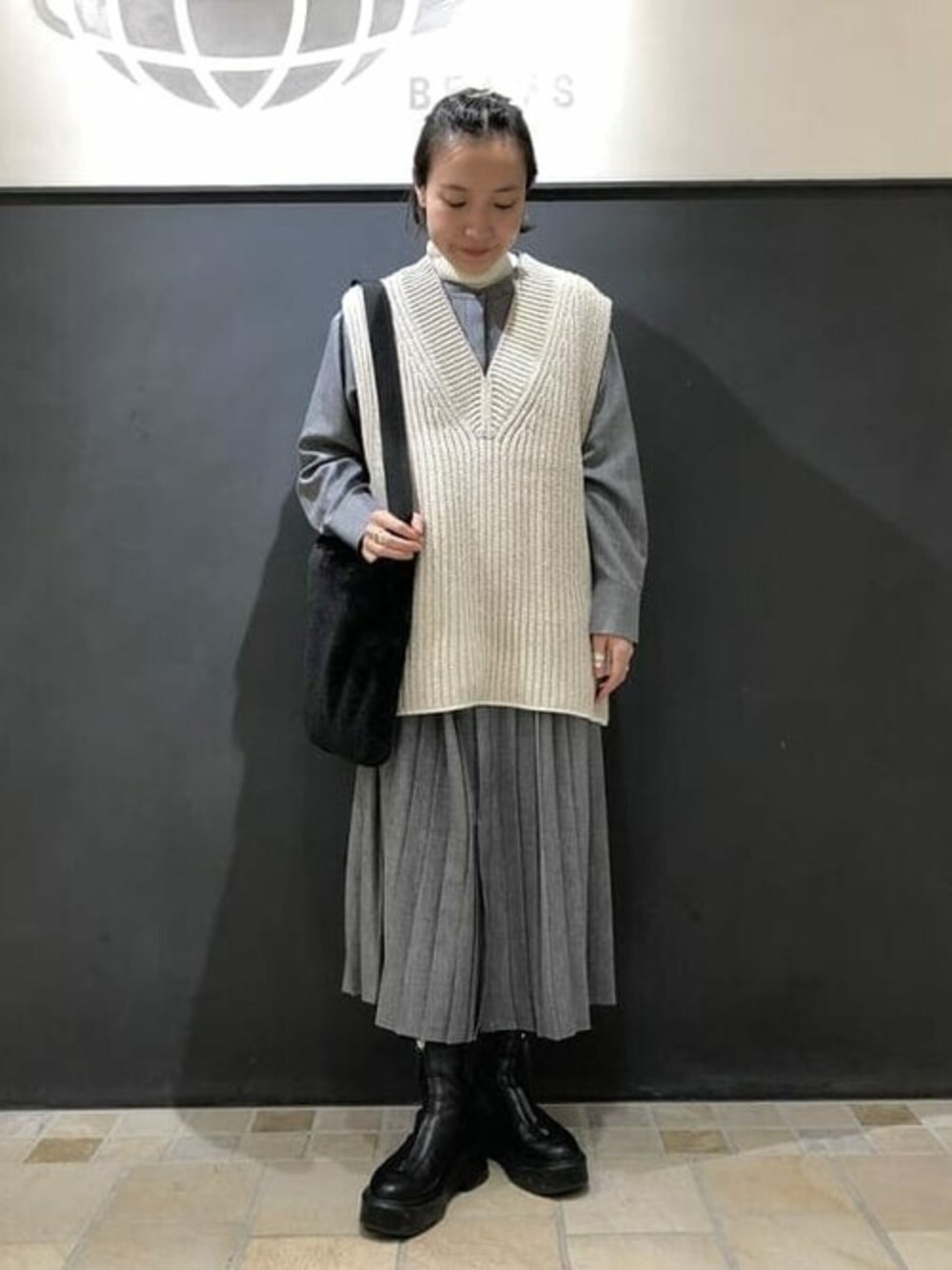プリーツキリカエシャツワンピースがアップデートして入荷してます。今回のは生地が上品です〜。ACNE STODIOSのベストを重ねてみました。