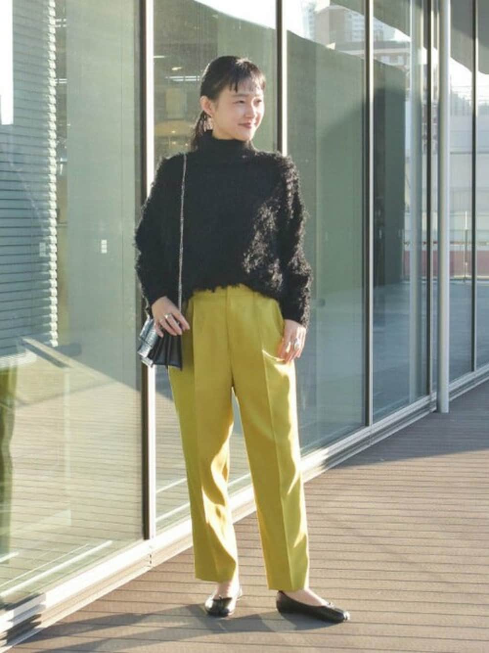 冬に映えるライムカラーのパンツを主役に!今季は細めなパンツが気になります。ボリュームのあるパンツはINして足なが〜くみえるように。