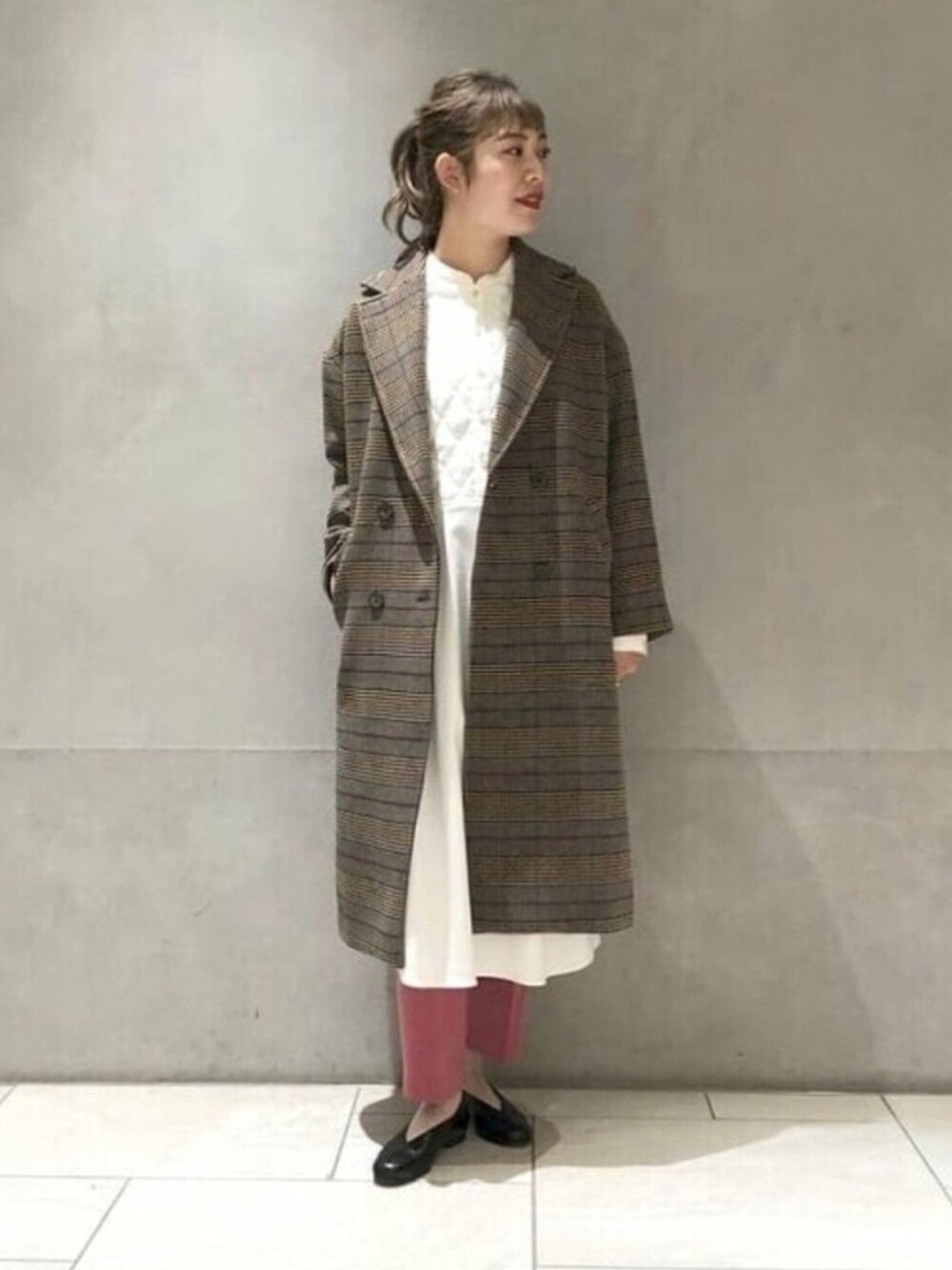 【11月】WEAR人気No.1アイテム‼️ グレンチェック ダブル チェスターコート チェスターコートとシャツワンピースで綺麗目な印象に♪カラーパンツを差し色にしてRay BEAMSらしいレイヤードコーデに仕上げました。